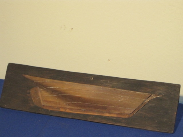 This may be the "sleeper" of the month as I cannot verify its age. However it is still nice looking half hull of a coastal schooner. It is not a builders half hull. The lines of what looks to be "lifts" are actually scribed into the hull.