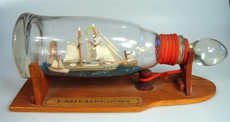 Nicely detailed topsail schooner sailing on a sea of blue with light whitecaps. The ship has 2 masts and 7 sails. The deck has 2 cabins, a life preserver and a flag from the stern. A sea gull flies in front of the bowsprit. There are 3 small fishing boats sailing nearby. The bottle is sealed with a solid glass lid and has a red rope around the neck securing it to the platform. The wooden base has a wooden plaque with the words "2-masted Rahschoner."