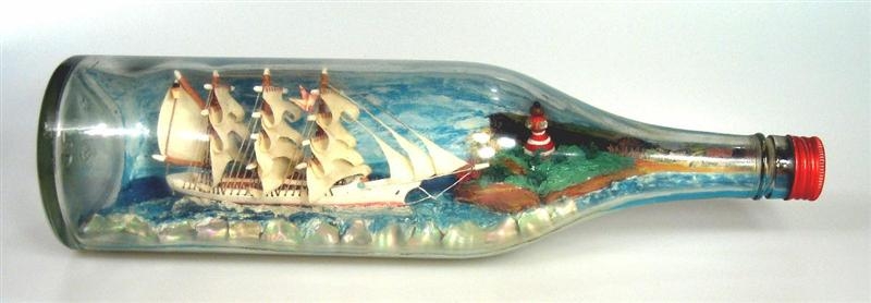An interesting model of a 3 masted ship sailing near land, The ship has 15 sails and 2 banners. The hull is red bottom and white top. The deck has 2 large cabins and red/green lights near the bow. The land extends into the length of the neck and has a large lighthouse sitting high on a cliff with bushes and scrubs around. There is a large scene of a long L-shaped building with other small buildings painted against on the inside of the bottle.