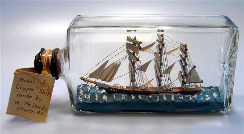 A very nice handmade clipper ship in a bottle sailing on a choppy sea of blue. The ship has 3 masts and flies 26 sails with drawn pencil lines. The rigging is very nice with standing rigging in black and running rigging in brown. The hull is black with detailing on the bow in gold. The deck has railing, cabins, hatches, and 2 lifeboats hanging from davits. The bottle is sealed with a cork and has black sealing wax covering the opening. The neck has a black Turks head knot around it. Attached to the neck is a tag hanging from a thread with the following: "Model of Clipper Ship made by W. McHardy, Oliver, B.C."