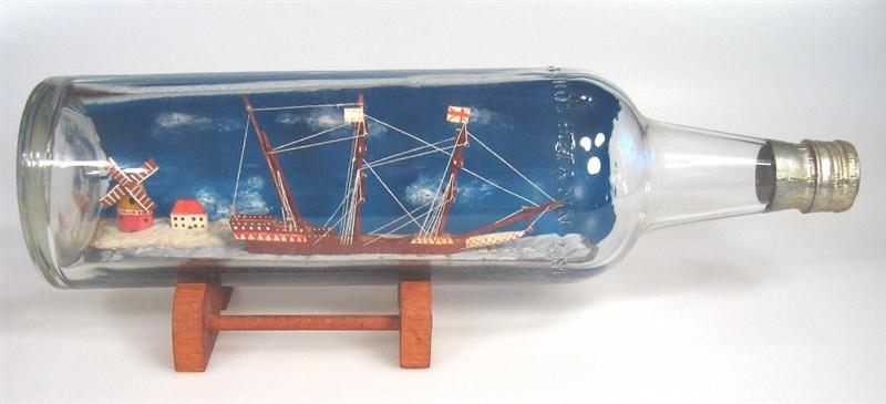 Colorful galleon passing a windmill and house on small patch of land. Individual deck planking, lifeboat, Capstan and great rigging. Two unidentifiable flags. Painted backdrop in dark blue with floating clouds.