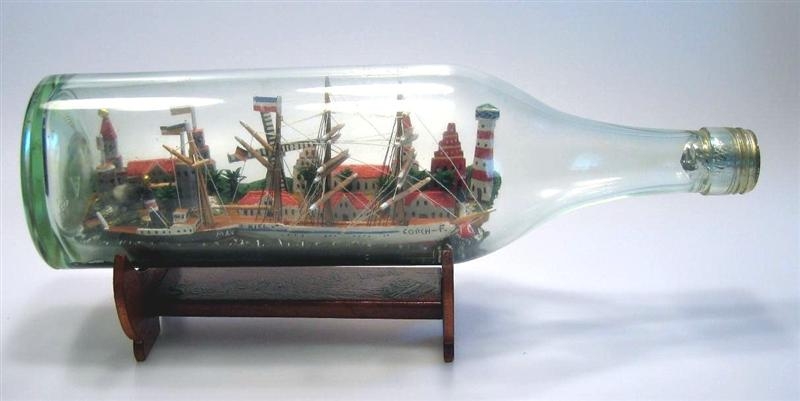 The land is full of buildings with 11 different structure including a castle, church, windmill, lighthouse, government buildings, and more. The castle is gray stone painted and there are turrets on each side and an archway in between. Above the arch is a gold ball and below that "T.C." (for Theodor Carstensen, the maker) and the date 1959. There are 8 trees among the buildings. The ship is sealed with a cork wrapped in Reynolds wrap. It sits on a homemade stand with the words "Seefahrt ist not" There is also an coat of arms painted on the stand.