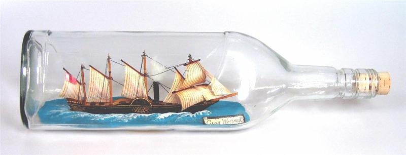 Nice model of the "Great Western" sailing on a sea of light blue. The ship has 4 masts and is steam powered. There are 8 sails and a smoke stack with smoke coming out. The hull is covered in paper showing details of the black hull, paddles, and gold relief work on the hull. The deck has drawn on features including planking, cabins, and hatches. There is a label in the bottle with "Great Western" on it. Under the bottle are 3 labels. One id "Made in Britain." One has "The Queen Range of Model Ships" with a wolf symbol. It goes on to give a brief history of the ship. The 3rd tag has "Made in England Penco Industries, Inc. New Bedford, Mass.