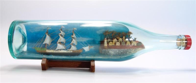 The island rises from the sea with sheer walls of granite or marble. The land is a carmel color with a tall lighthouse positioned at the sea edge of the island. There are 11 detailed and varied buildings including 2 churches with tall steeples and one with a castle like turret. There is a grove of 19 palm trees in background and 2 among buildings. There is a light blue sky with floating clouds pained on the inside of the bottle.