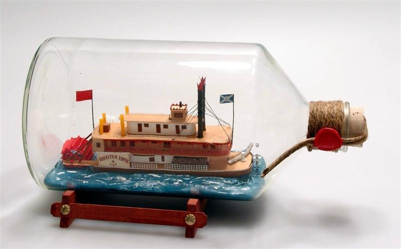 Very well-made and detailed steam paddle boat. Made in multiple sections and assembled in the bottle. 4 separate deck levels with railing on each deck. The top deck has the pilots quarters. There are 2 large smoke stacks and 4 additional funnels. The rear mounted paddle is made from plastic. There is rigging going from the deck to the smoke stacks. Numerous windows and doors done in relief. There is a passenger gang plank on the front of the boat. There is a large amount of stacked wood logs used for the steam engine. Sports an unidentified flag in front and one in the rear.