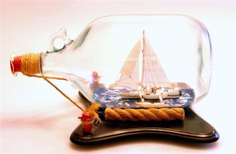 Wonderfully built and highly detailed Trimaran approximately 6" long and 4" wide with extending pontoons. 3 Large sails with number 33 on largest with detailed rigging and block and tackle. Captain figure on board steering the boat. Nice stand with lifejacket on the cork sealing the bottle. Ship is tied down to pier posts.